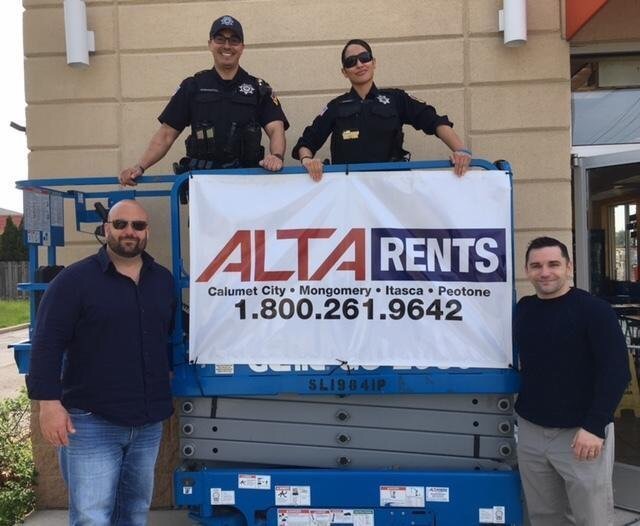 When the Calumet City Police Department contacted Alta Equipment for help with their 16th annual Dunkin’ Donuts Cop on a Rooftop event, Alta was happy to provide their support. Jim Lynch, Branch Manager for Alta Equipment in Calumet City, worked with the police department to coordinate the donation of a scissor lift rental that allowed Officer Bogdanovich and Officer Chaves to make it safely to the top of the Dunkin’ Donuts Rooftop in River Oaks. This is the second year in a row Alta has donated an equipment rental in support of the Cop on a Rooftop event.